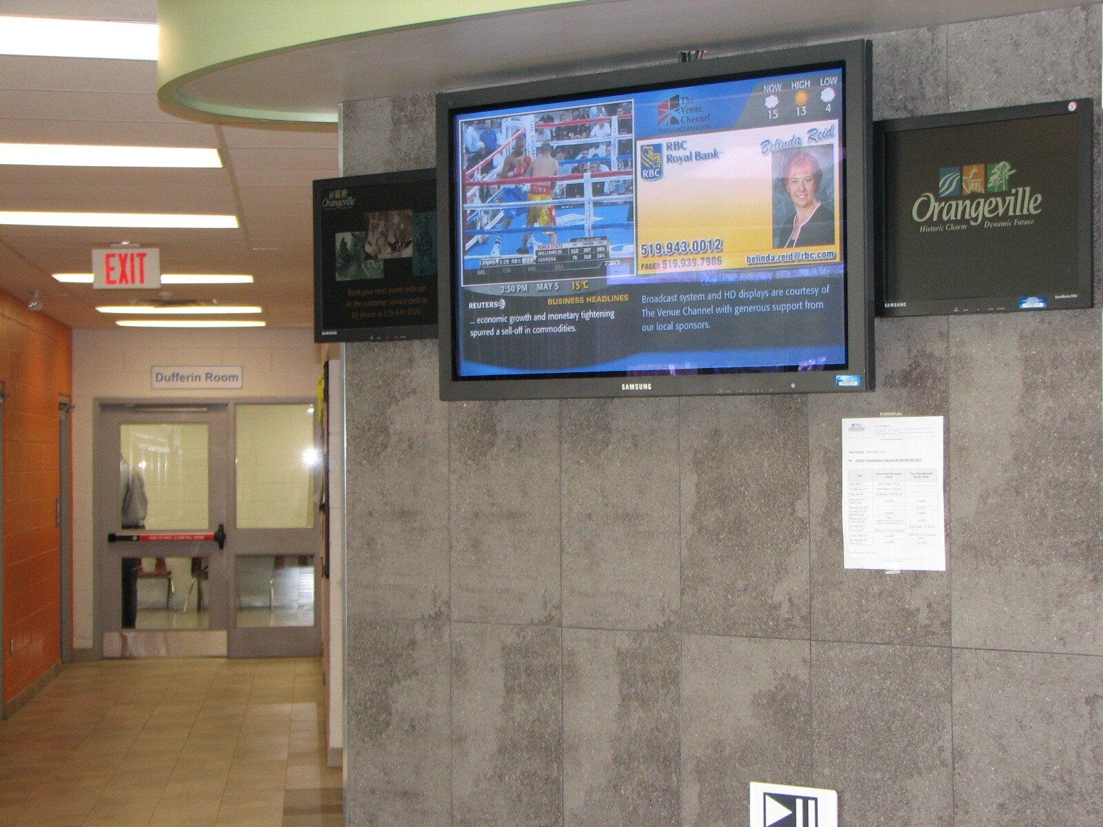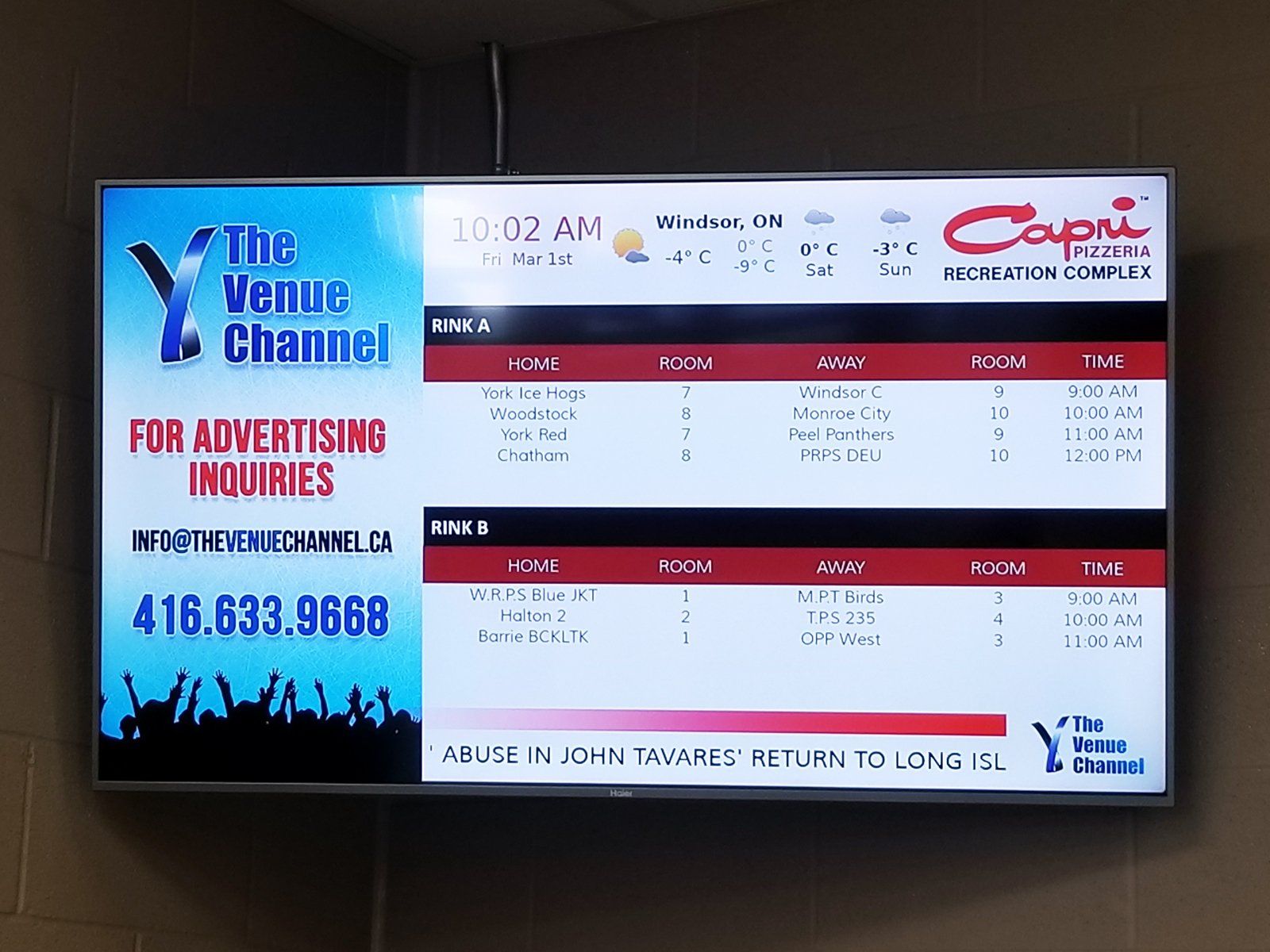 We can offer digital screens in arenas, scheduling screens in arenas, and outdoor digital displays located on major streets seen
